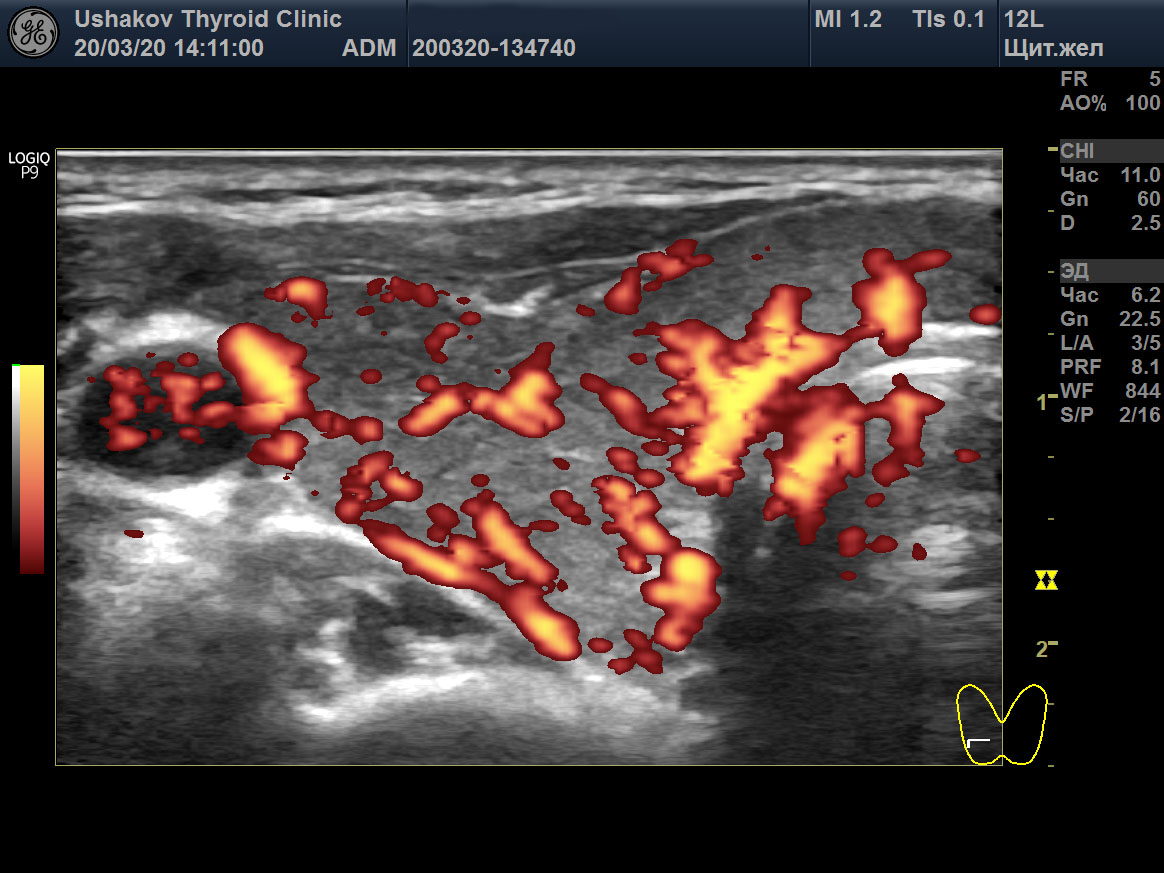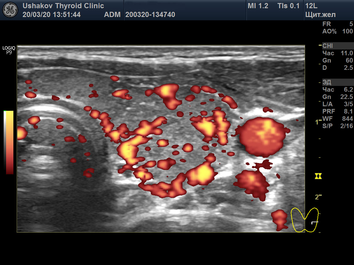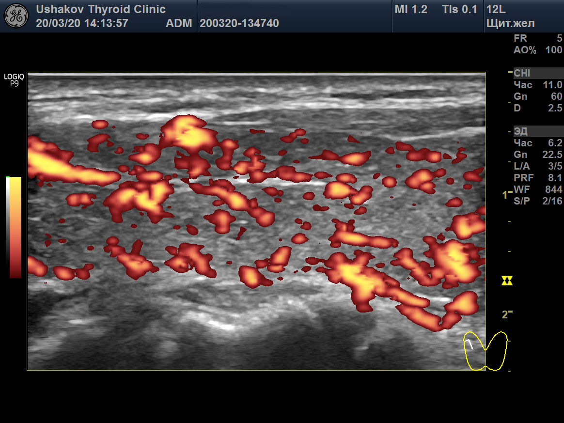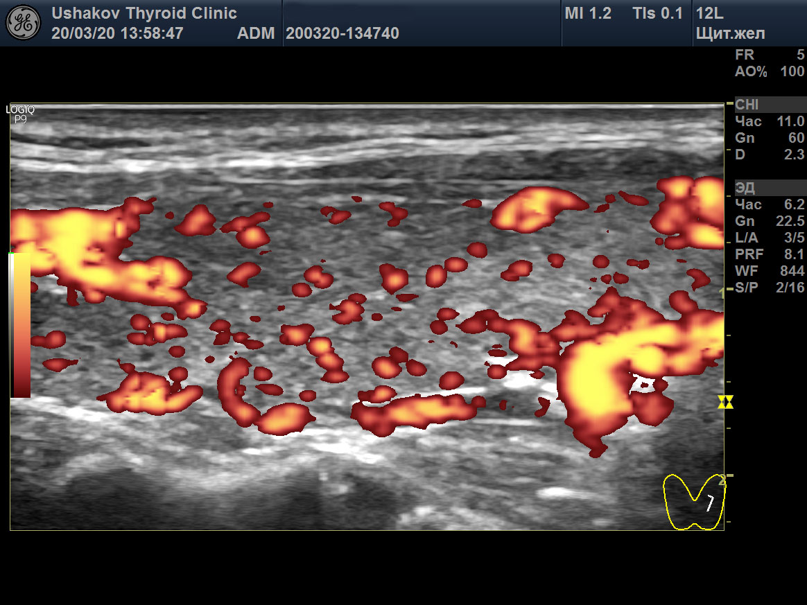 снимках ниже, где показаны две доли ЩЖ пациентки 31 года в режиме ЭДК и ПССК в системе верхних щитовидных артерий (ВЩА). Интенсивность кровотока при ЭДК усилена до значительной степени, а ПССК – до умеренно избыточной величины (норма 20-30 см/с [127]).