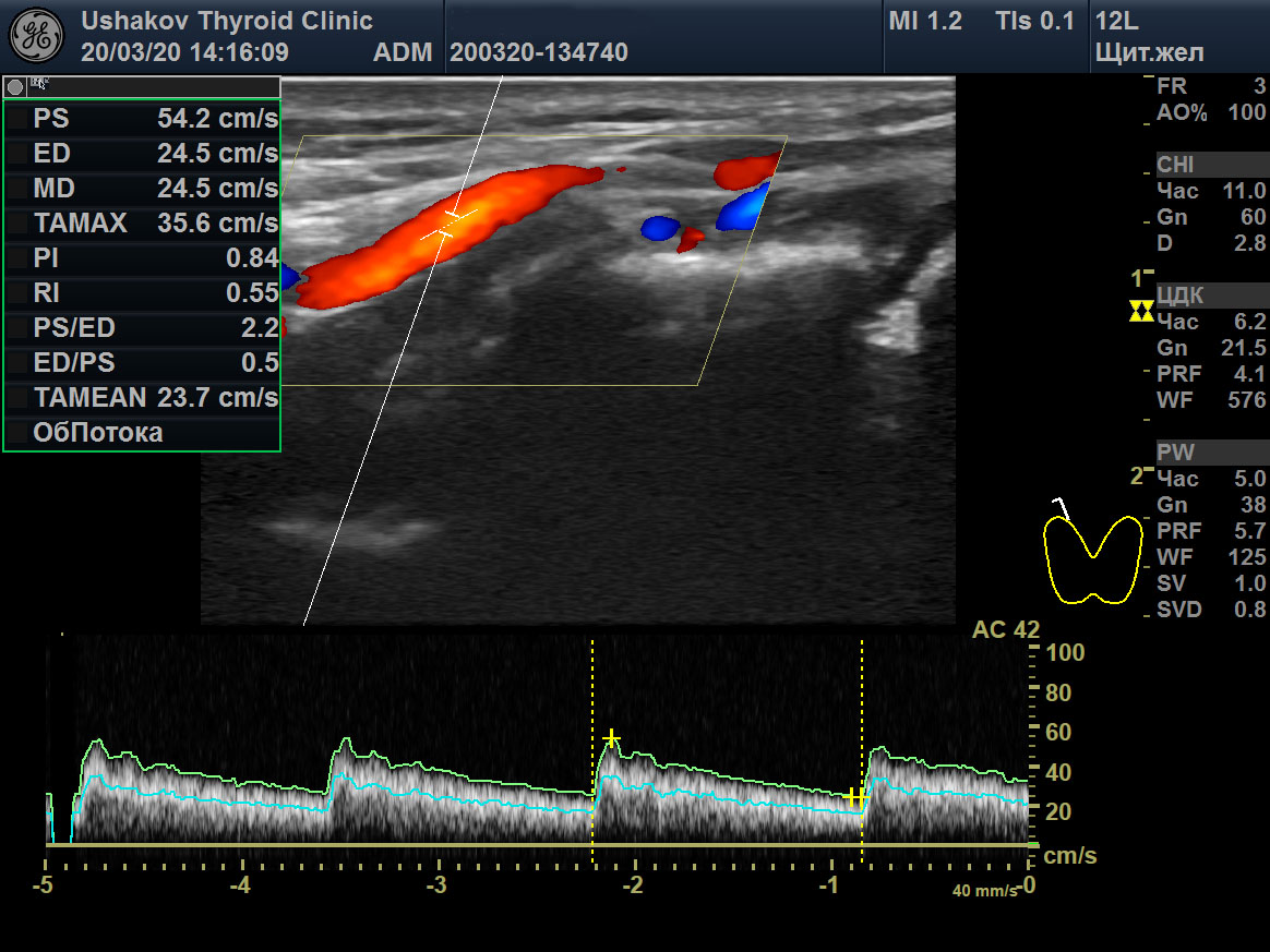В результате при обращении в нашу Клинику были выявлены признаки значительного перенапряжения ЩЖ по данным УЗИ в виде значительной интенсификации тиреоидного кровотока (